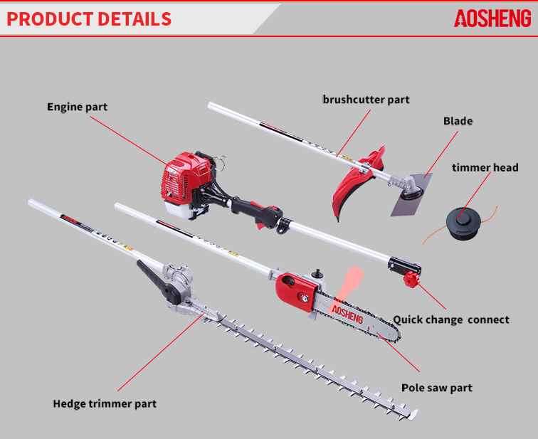 Pemotong multi-brush termasuk pemangkas lindung nilai, gergaji tiang, dan bilah tangan pemangkas.
