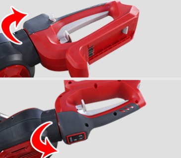 | 04Tuas sakelar depanPemangkas lindung nilai dapat dimulai hanya jika kedua tuas sakelar (di belakang dan depan pegangan) mengalami depresi secara bersamaan. |